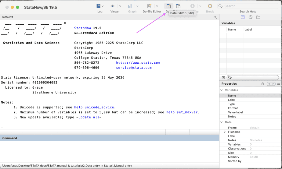 To manually enter data into Stata, open Stata, go to Stata Toolbar, then click on Data Editor (Edit).