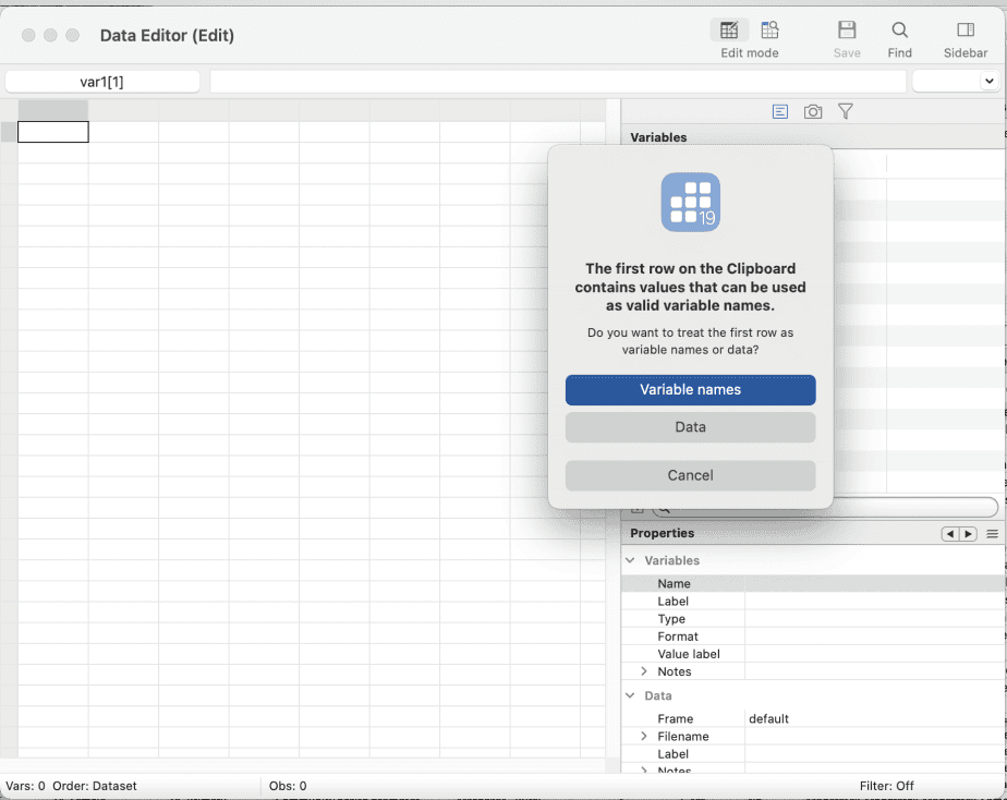 A pop-up message will appear asking you if you would like to treat the first row as the variable names or data. If the first row contains variable names, select the option variable names.