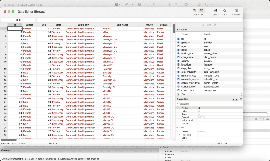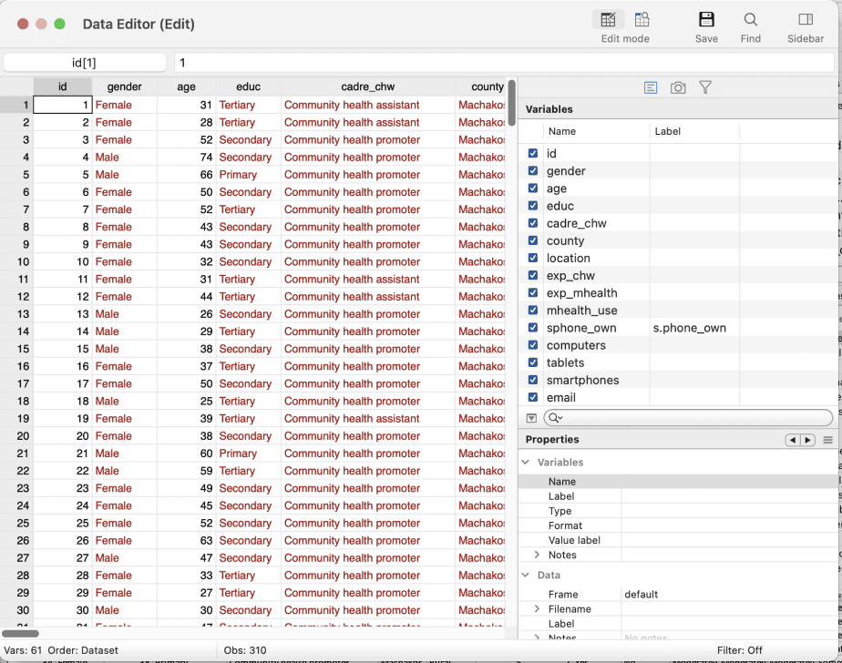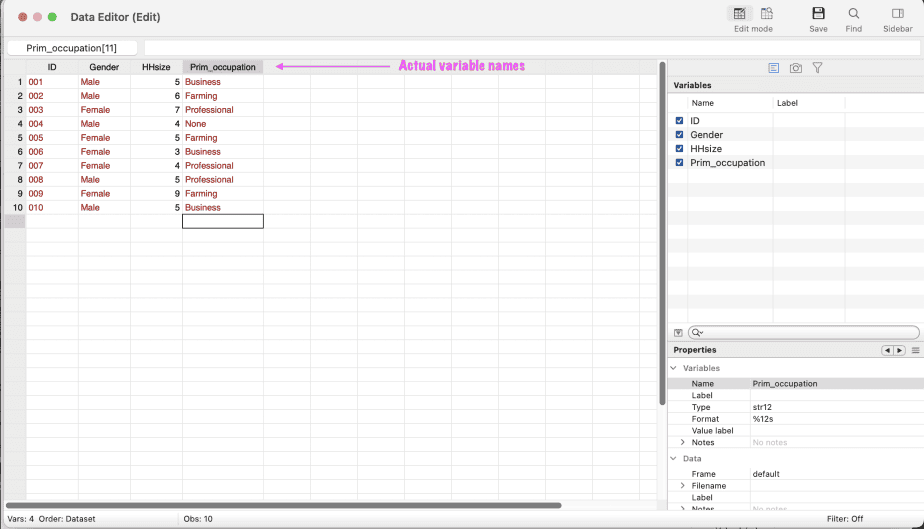 This will open the Stata spreadsheet. The rows in the spreadsheet represent individual observations (for instance, individual respondents) whereas the columns represent the variables.