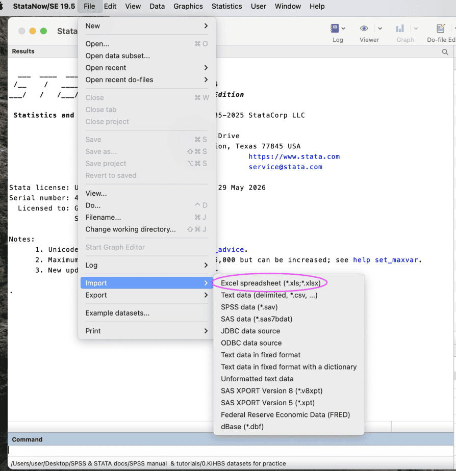 To import data from an Excel spreadsheet, open Stata, click the File menu, and then click the import option.