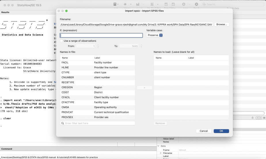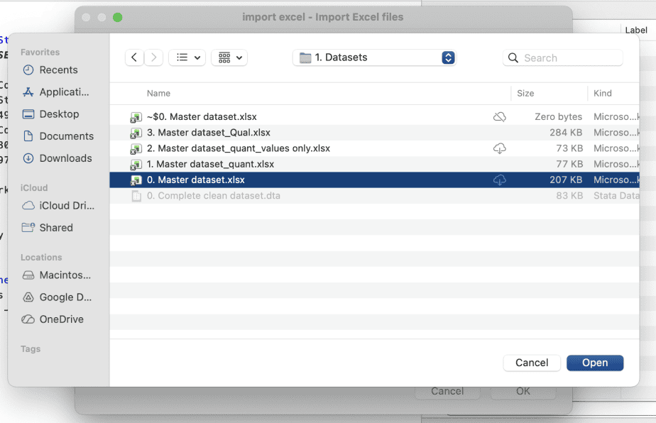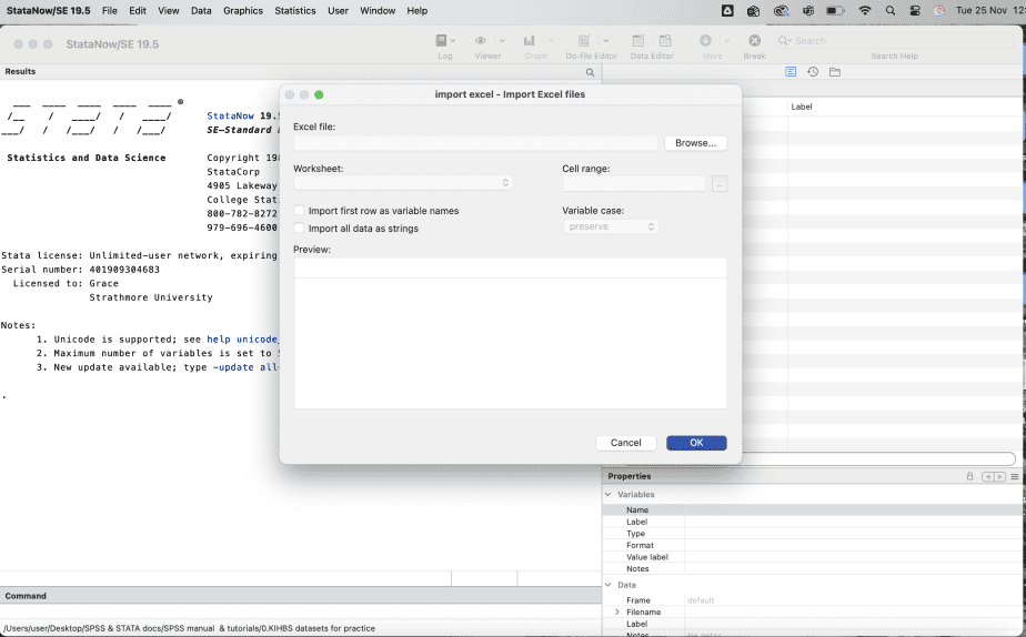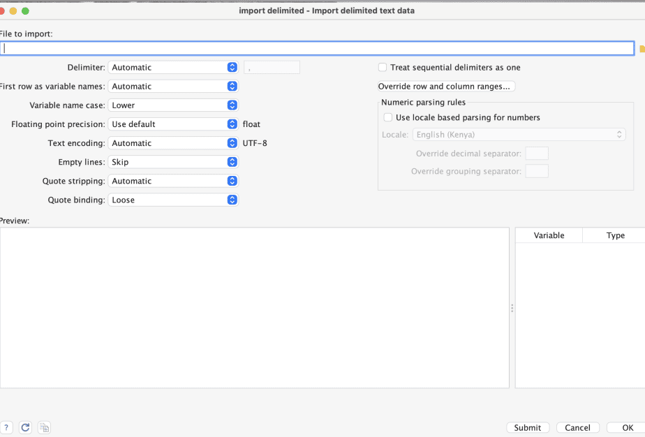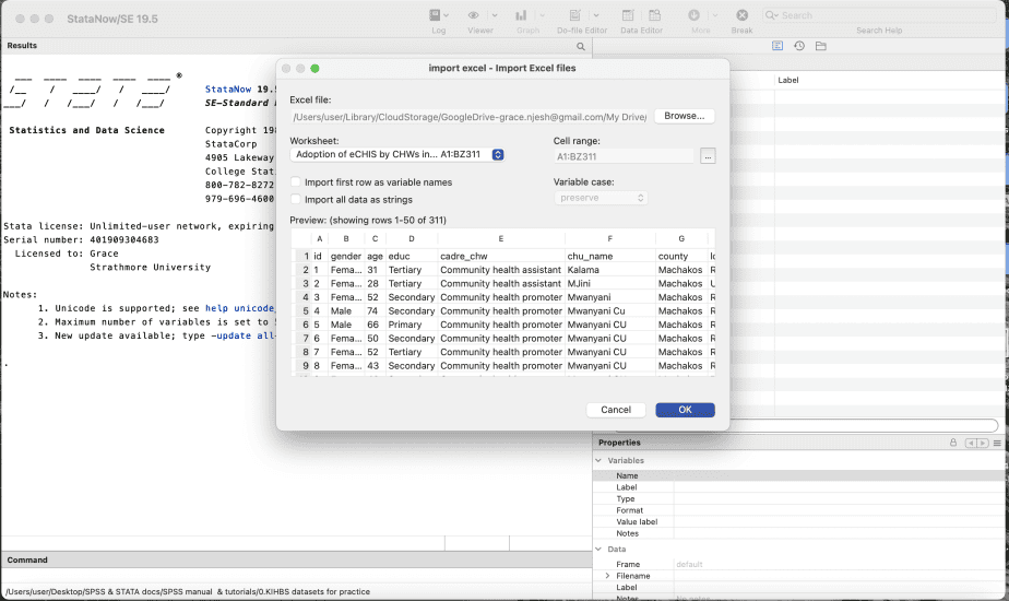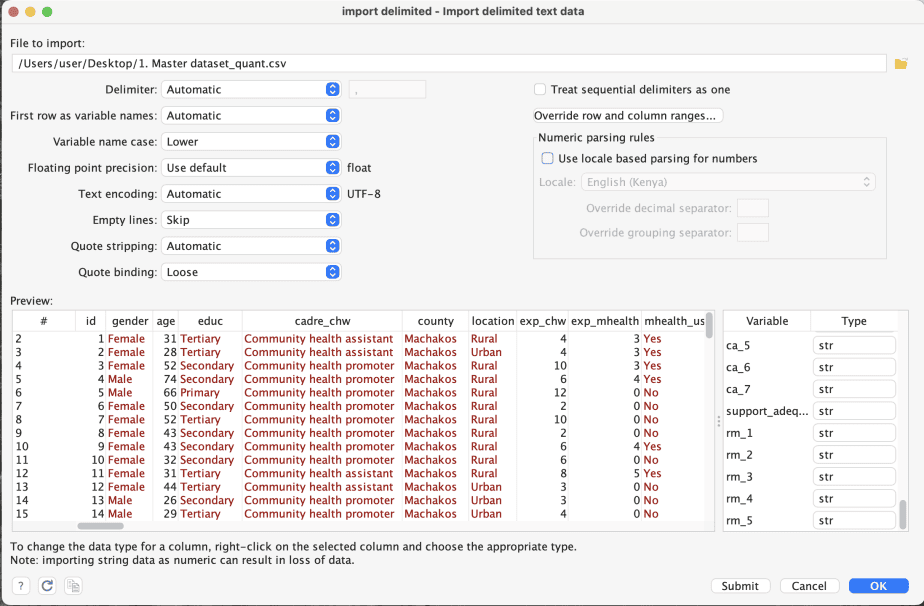 Make sure to check the option “Import first row as variable names.” This will ensure that the first row in the Stata file contains the variable names as they appear in the Excel spreadsheet. Then click OK.