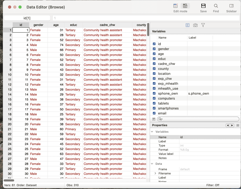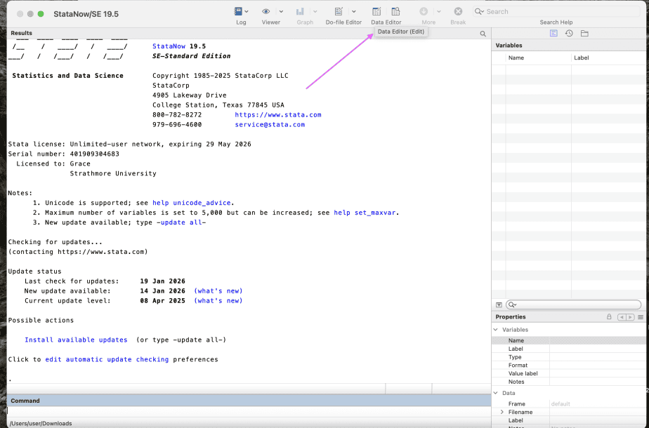 The data will now be imported into Stata. To view the data, click on Data Editor (Browse).