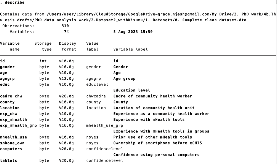 The description of the data will be displayed in the Results window and includes: the variable names, the storage type of each variable, the display format, value labels attached to the categorical variables, and variable labels.