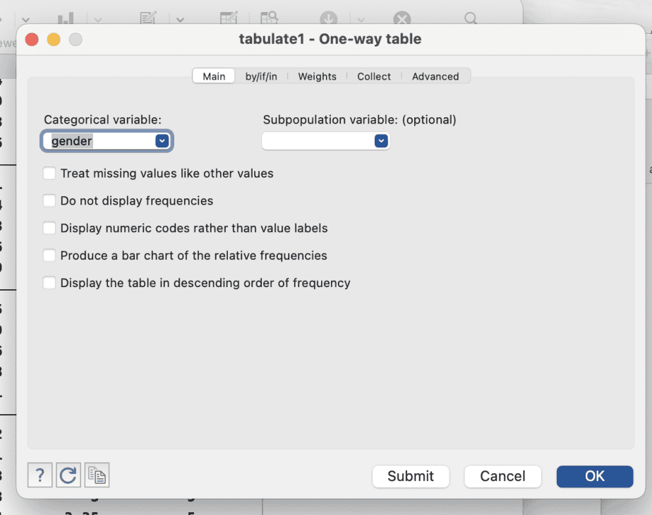The tabulate-one-way table dialogue box will open. Specify the categorical variable of interest and click OK.