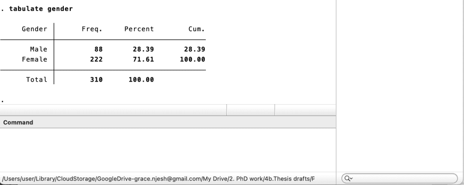 The command syntax for one-way tabulations is tabulate [variable name] e.g tabulate gender.