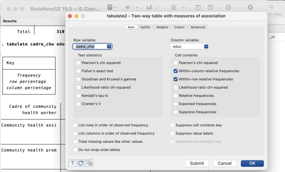 The tabulate-two-way table with measures of association dialogue box will open. Specify the row variable and the column variable of interest. Then select the options “within-column relative frequencies” and “within-row relative frequencies”. Click OK.
