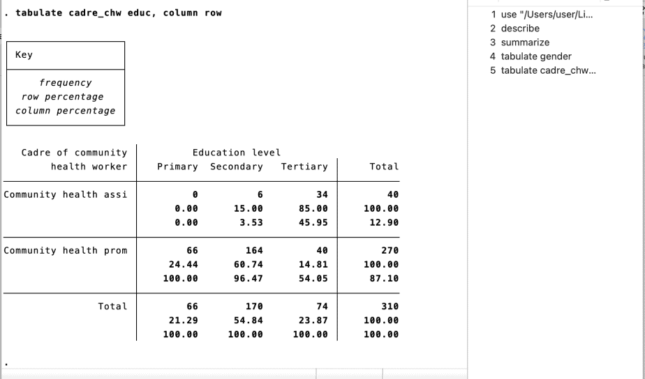 The command syntax for producing two-way tabulations with measures of association is: tabulate [variable 1] [variable 2], column row e.g tabulate cadre_chw educ, column row