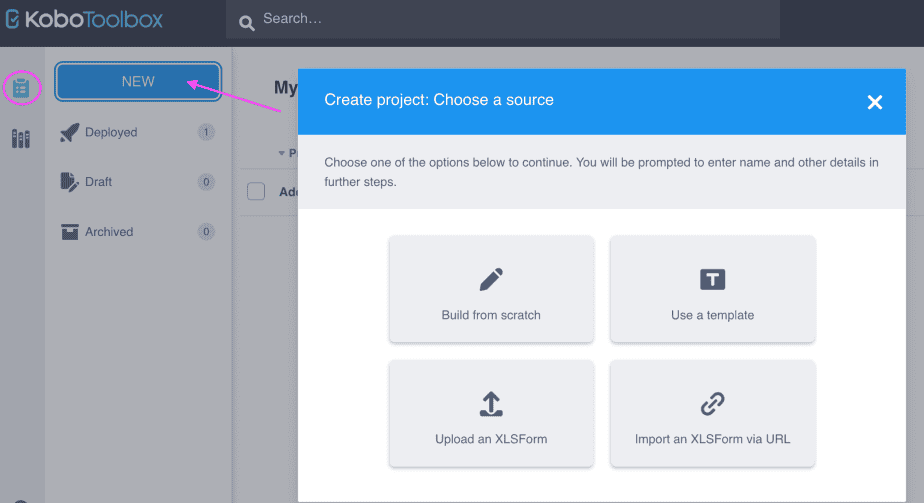 To create a new form from scratch in KoboToolbox, go to Projects, then click new.