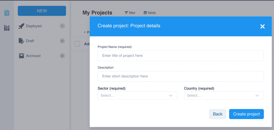 Fill in the form with the project name, description, sector and country and click “Create project.”