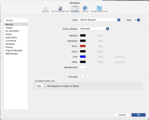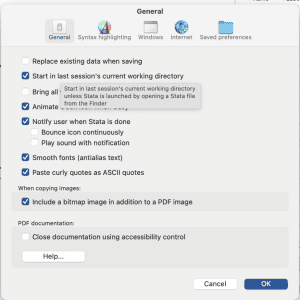 For Mac users, Stata Preferences is located on the Stata menu: Go to Stata menu > Settings .
