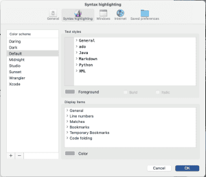General preferences settings include: general tab, syntax highlighting tab, windows tab, internet tab, and saved preferences tab.